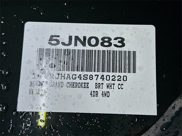 Bright White Clearcoat 2025 Jeep Grand Cherokee Altitude X 4WD 3.6L V6 24V VVT 4D Sport Utility 8-Speed Automatic 4WD, 115V Auxiliary Power Outlet, 180 Amp Alternator, 4-Wheel Disc Brakes, 6 Speakers, ABS brakes, Air Conditioning, Alloy wheels, Altitude X, AM/FM radio: SiriusXM, Anti-whiplash front head restraints, Automatic Headlamp Levelling System, Automatic temperature control, Black Headliner, Brake assist, Bumpers: body-color, Capri Leatherette/Suede Seats, Class IV Receiver Hitch, Cloth Seats, Compass, Delay-off headlights, Delete Laredo Badge, Driver door bin, Driver vanity mirror, Dual front impact airbags, Dual front side impact airbags, Electronic Stability Control, Emergency communication system, Four wheel independent suspension, Front anti-roll bar, Front Bucket Seats, Front Center Armrest w/Storage, Front dual zone A/C, Front License Plate Bracket, Front reading lights, Fully automatic headlights, Gloss Black Exterior Accents, Heated door mirrors, Heated Front Seats, Heated Steering Wheel, Heavy-Duty Engine Cooling, Illuminated entry, Knee airbag, Low tire pressure warning, Model Year Tracking, Normal Duty Suspension, Occupant sensing airbag, Outside temperature display, Overhead airbag, Overhead console, Panic alarm, ParkView Rear Back-Up Camera, Passenger door bin, Passenger vanity mirror, Power door mirrors, Power driver seat, Power Liftgate, Power steering, Power Sunroof, Power windows, Quick Order Package 23M Altitude X, Radio data system, Rain Sensitive Windshield Wipers, Rear anti-roll bar, Rear Load Levelling Suspension, Rear reading lights, Rear window defroster, Rear window wiper, Remote keyless entry, Remote Start System, Security system, Selectable Tire Fill Alert, Speed control, Speed-Sensitive Wipers, Split folding rear seat, Spoiler, Steering wheel mounted audio controls, Tachometer, Telescoping steering wheel, Tilt steering wheel, Traction control, Trailer Hitch Zoom, Trailer Tow Package, Trip computer, Variably intermittent wipers, Voltmeter, Wheels: 17 x 6.5 Fully Painted Aluminum, Wheels: 18 x 8 Fully Painted Aluminum 1, Wheels: 20 x 8.5 Gloss Black Painted Aluminum, Wireless Charging Pad, 4WD.