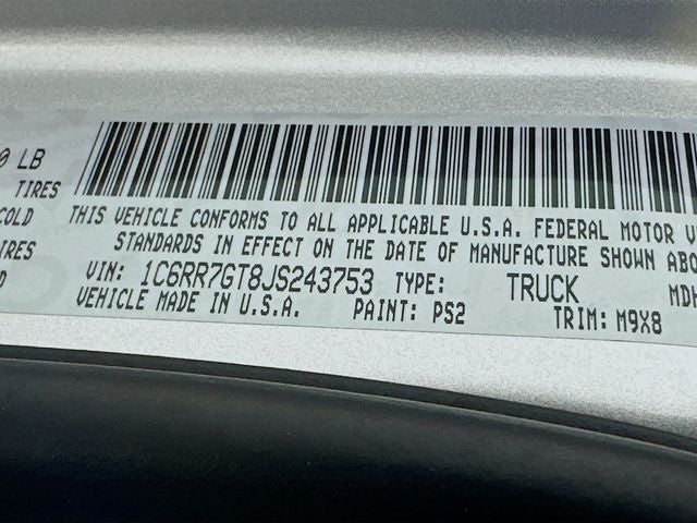 1500 Big Horn, 4D Quad Cab, HEMI 5.7L V8 Multi Displacement VVT, 4WD, Bright Silver Metallic Clearcoat, Diesel Gray/Black Cloth, 1-Yr SiriusXM Guardian Trial, 115V Auxiliary Power Outlet, 40/20/40 Split Bench Seat, 8.4 Touchscreen Display, Apple CarPlay, Auto-Dimming Exterior Mirrors, Auto-Dimming Rear-View Mirror, Big Horn Badge, Big Horn Regional Package, Bright/Bright Billets Grille, Charge Only Remote USB Port, Class IV Receiver Hitch, Dual Rear Exhaust w/Bright Tips, Electric Shift-On-Demand Transfer Case, Electroluminescent Instrument Cluster, Exterior Mirrors Courtesy Lamps, Exterior Mirrors w/Supplemental Signals, Folding Flat Load Floor Storage, Front Armrest w/3 Cupholders, Front Center Seat Cushion Storage, Front Fog Lamps, Glove Box Lamp, Google Android Auto, GPS Antenna Input, HD Radio, Heated Front Seats, Heated Seats & Wheel Group, Heated Steering Wheel, Humidity Sensor, Integrated Voice Command w/Bluetooth®, Leather Wrapped Steering Wheel, LED Bed Lighting, Media Hub (2 USB, AUX), Overhead Console w/Garage Door Opener, ParkSense Rear Park Assist System, Power 10-Way Driver Seat, Power Heated Fold-Away Mirrors, Power Lumbar Adjust, Power-Folding Mirrors, Premium Cloth 40/20/40 Bench Seat, Protection Group, Quick Order Package 27S Big Horn, Radio: Uconnect 4C w/8.4 Display, Rear 60/40 Split Folding Seat, Rear Dome w/On/Off Switch Lamp, Remote Start System, Security Alarm, SiriusXM Satellite Radio, Steering Wheel Mounted Audio Controls, Sun Visors w/Illuminated Vanity Mirrors, Tow Hooks, Universal Garage Door Opener, USB Host Flip, Wheels: 20 x 8 Aluminum Chrome Clad, 3.21 Rear Axle Ratio, 3.92 Rear Axle Ratio, 4-Wheel Disc Brakes, 6 Speakers, ABS brakes, Active Grille Shutters, Air Conditioning, Alloy wheels, AM/FM radio: SiriusXM, Anti-Spin Differential Rear Axle, Black Exterior Mirrors, Brake assist, Bumpers: chrome, Center Hub, Class IV Receiver Hitch (DISC), Compass, Delay-off headlights, Driver door bin, Dual front impact airbags, Dual front side impact airbags, Electronic Shift, Electronic Stability Control, Exterior Mirrors w/Heating Element, Front & Rear Rubber Floor Mats, Front anti-roll bar, Front Center Armrest w/Storage, Front reading lights, Front wheel independent suspension, Fully automatic headlights, Heated door mirrors, Illuminated entry, Low tire pressure warning, Manufacturer's Statement of Origin, Occupant sensing airbag, Outside temperature display, Overhead airbag, Overhead console, Panic alarm, ParkView Rear Back-Up Camera, Passenger door bin, Passenger vanity mirror, Power door mirrors, Power steering, Power windows, Radio data system, Rear anti-roll bar, Rear step bumper, Rear Window Defroster, Remote keyless entry, Speed control, Tachometer, Tilt steering wheel, Tip Start, Traction control, Trip computer, Variably intermittent wipers, Voltmeter, 1500 Big Horn, 4D Quad Cab, HEMI 5.7L V8 Multi Displacement VVT, 4WD, Bright Silver Metallic Clearcoat, Diesel Gray/Black Cloth, 1-Yr SiriusXM Guardian Trial, 115V Auxiliary Power Outlet, 40/20/40 Split Bench Seat, 8.4 Touchscreen Display, Apple CarPlay, Auto-Dimming Exterior Mirrors, Auto-Di