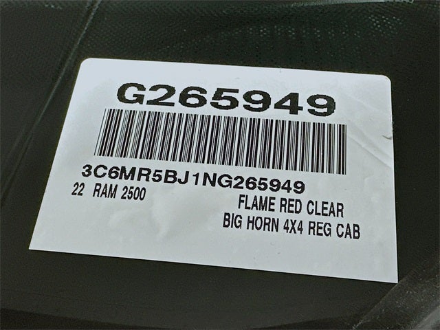 2500 Big Horn, FCA US LLC Certified Pre-Owned Certified, 2D Standard Cab, 6.4L V8, 4WD, Flame Red Clearcoat, Black Cloth, 4 Way Front Headrests, 40/20/40 Split Bench Seat, Auto-Dimming Rear-View Mirror, Center Hub, Center Stack Storage Drawer, Cloth 40/20/40 Premium Bench Seat, Dual Glove Boxes, Foam Bottle Insert (Door Trim Panel), Footwell Courtesy Lamp, Front Armrest w/Cupholders, Front Center Seat Cushion Storage, Front Fog Lamps, Glove Box Lamp, GPS Navigation, Heated Front Seats, Heated Seats & Wheel Group, Heated Steering Wheel, Leather Wrapped Steering Wheel, Level A Equipment Group, Locking Lower Glove Box, Manual Adjust 4-Way Front Passenger Seat, Power 2-Way Driver Lumbar Adjust, Power Adjust 8-Way Driver Seat, Power Adjustable Pedals, Protection Group, Quick Order Package 2GZ Big Horn, Rear Dome w/On/Off Switch Lamp, Rear Sliding Window, Steering Wheel Mounted Audio Controls, Sun Visors w/Illuminated Vanity Mirrors, Universal Garage Door Opener, Wheels: 18 x 8.0 Polished Aluminum, 115V Auxiliary Front Power Outlet, 3.73 Axle Ratio, 4-Wheel Disc Brakes, 400W Inverter, 4G LTE Wi-Fi Hot Spot, 6 Speakers, 8.4 Touchscreen Display, ABS brakes, Air Cond ATC w/Dual Zone Control, Air Conditioning, Alexa Built-In, All R1 High Radios, All Radio Equipped Vehicles, AM/FM radio: SiriusXM, Anti-Spin Differential Rear Axle, Apple CarPlay, Apple CarPlay/Android Auto, Brake assist, Bumpers: chrome, Cloth 40/20/40 Bench Seat, Cluster 7.0 TFT Color Display, Compass, Connected Travel & Traffic Services, Connectivity - US/Canada, Delay-off headlights, Disassociated Touchscreen Display, Driver door bin, Dual front impact airbags, Dual front side impact airbags, Electronic Stability Control, Electronically Controlled Throttle, Exterior 115V AC Outlet, For Details, Visit DriveUconnect.com, For More Info, Call 800-643-2112, Front anti-roll bar, Front Center Armrest w/Storage, Front reading lights, Fully automatic headlights, Global Telematics Box Module (TBM), Google Android Auto, GPS Antenna Input, HD Radio, Heated door mirrors, Illuminated entry, Integrated Center Stack Radio, Integrated Voice Command w/Bluetooth®, Low tire pressure warning, Manual Adjust 4-Way Driver Seat, Occupant sensing airbag, Off-Road Info Pages, Outside temperature display, Overhead airbag, Overhead console, Panic alarm, ParkSense Front/Rear Park Assist System, ParkView Rear Back-Up Camera, Passenger door bin, Passenger vanity mirror, Power door mirrors, Power steer